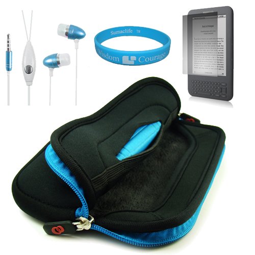Blue Premium Durable Jet Neoprene Protective Glove Sleeve Case Cover for Amazon Kindle 3 Wireless Reading Device 3G Wi-Fi 6 inch Display + Clear Screen Protector for Amazon Kindle 3G Wi-Fi + Hi-Fi Noise Reducing Hands Free / Headphones with Mic + SumacLife TM Wisdom Courage Wristband Review