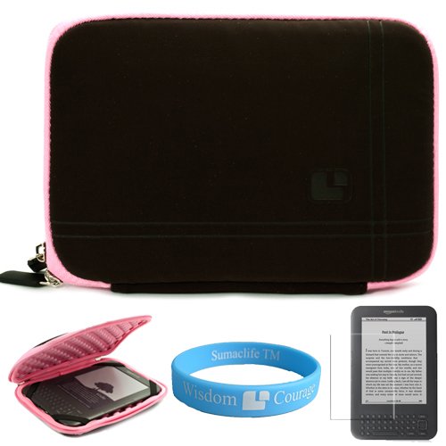 Brown with Pink Trim Protective Nubuck Carrying Sleeve with Zippered Accessory Pocket for Amazon Kindle 3 Wireless Reading Device 6 Inch LCD Display Screen + Screen Protector for Kindle 3 + SumacLife TM Wisdom*Courage Wristband Review